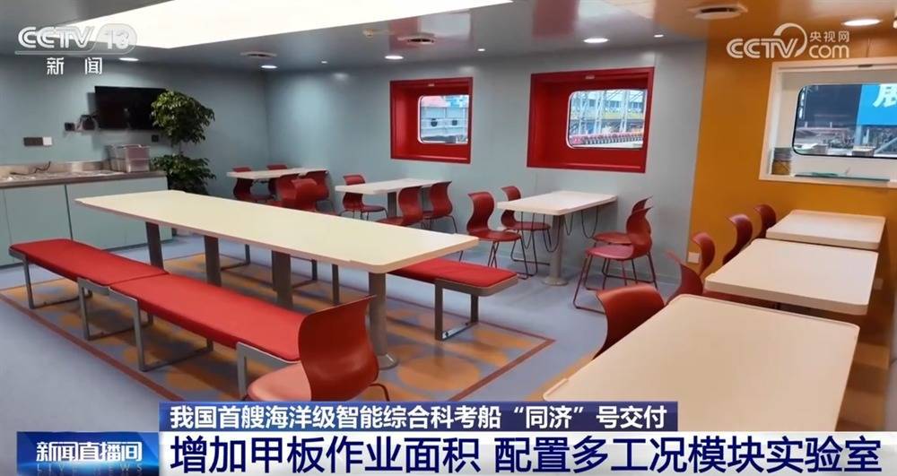 值多礼贴的是,“同济”号在2000吨级船舶平台基础上,通过优化布局,在船上假想出460浅薄米的船面功课面积、320浅薄米的实践室区域、东谈主均10.2浅薄米的居住舱室和共计一百多浅薄米的会议区、路线教室、稳定区、健身区等,以较小的体量竣事了3000吨级科考船的功课能力。