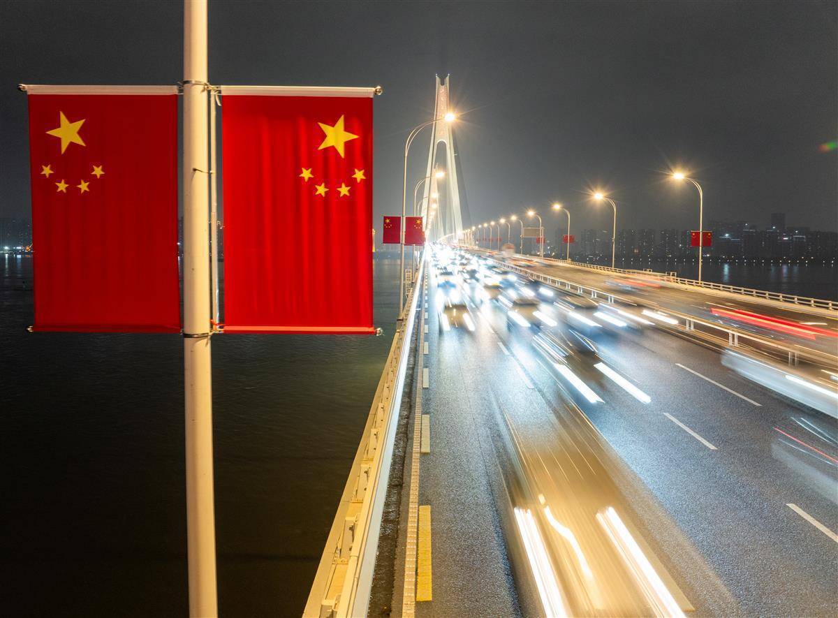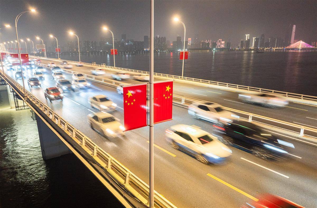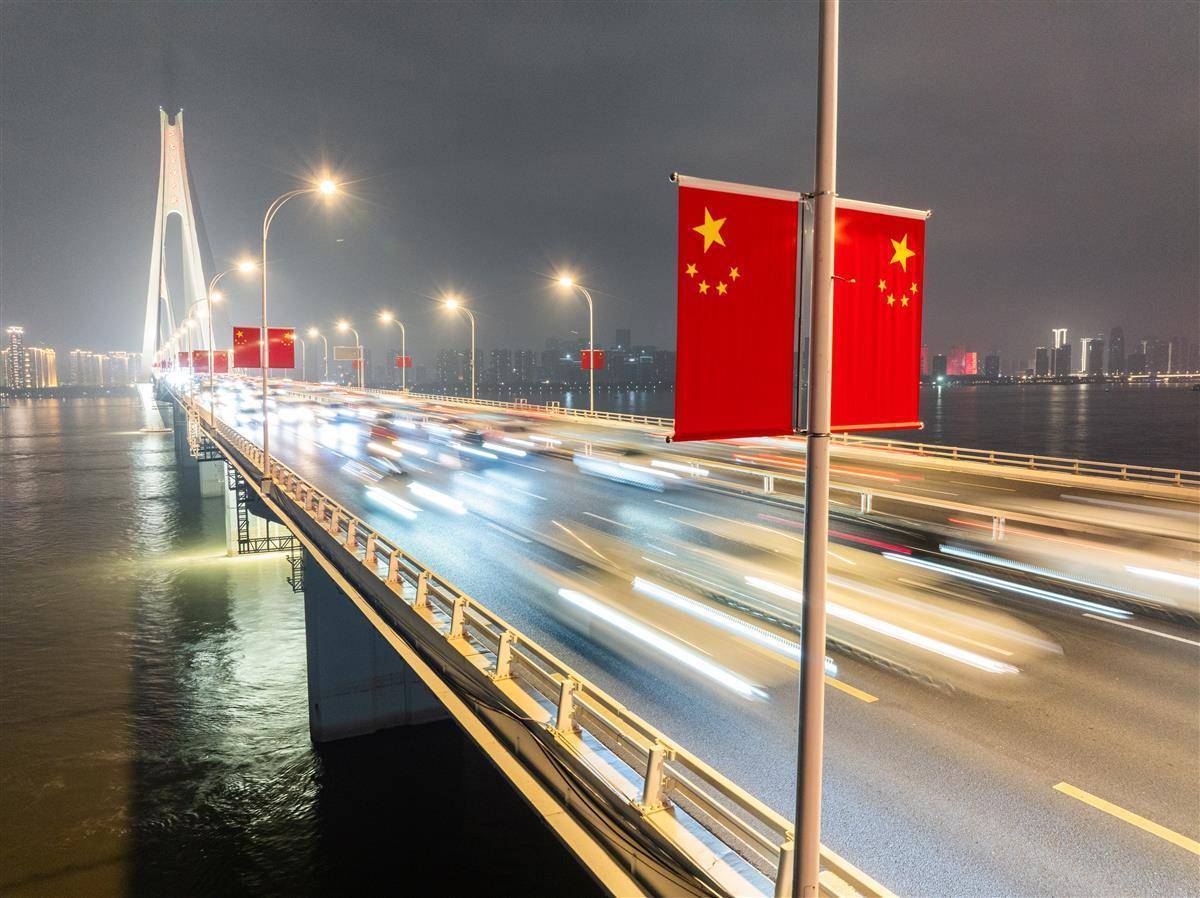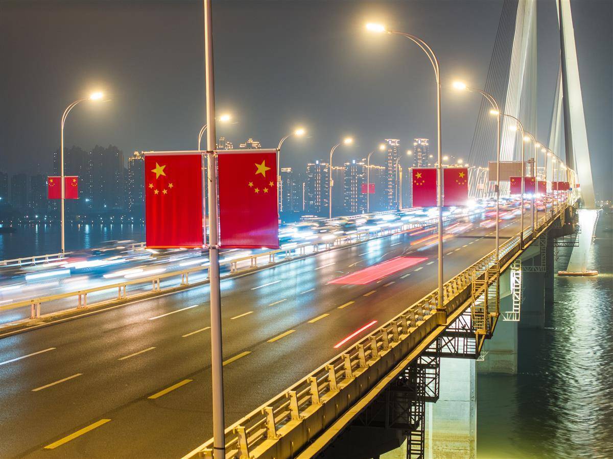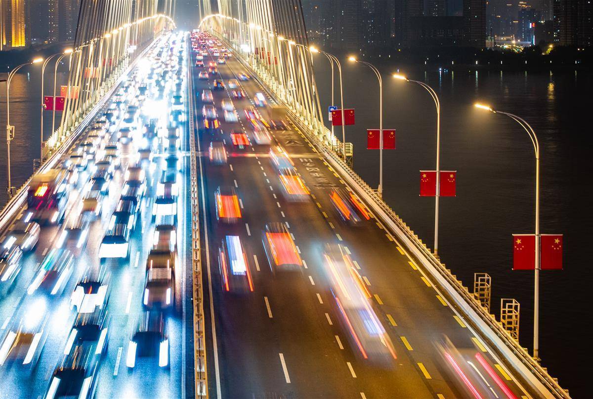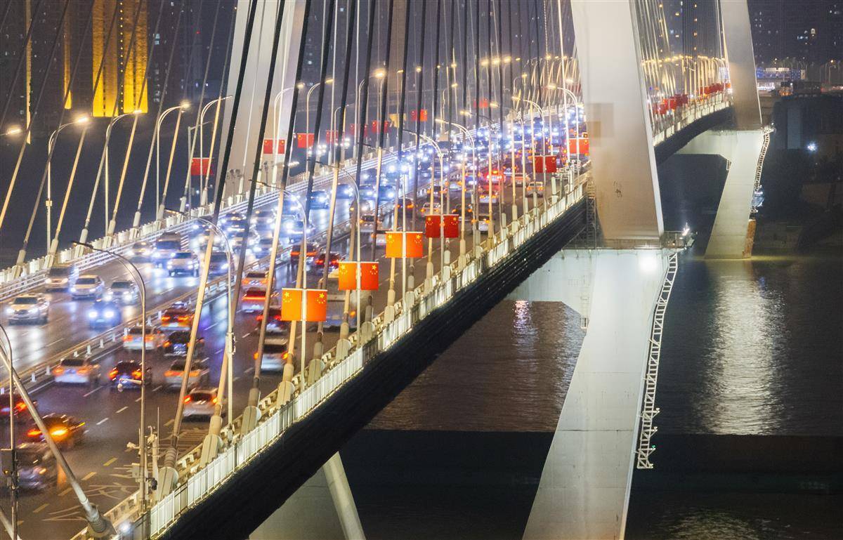 9月30日晚,节前晚岑岭,武汉二七长江大桥上连绵不休。大桥双方吊挂的五星红旗磨灭让闪,让每一颗踏上归程的心,王人在这份尊严而温煦的氛围中找到了节日的包摄感。(湖北日报全媒记者 柯皓 摄)