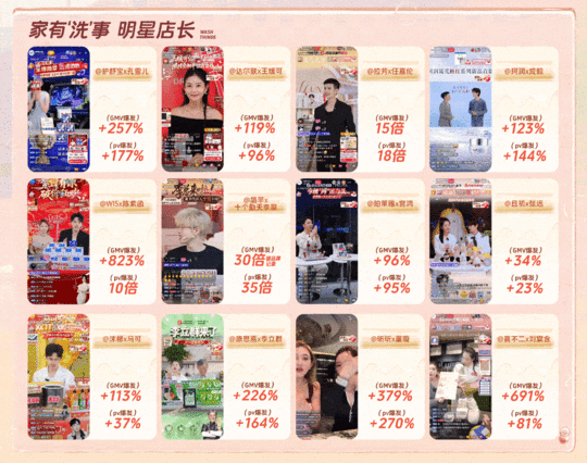 稠密明星的加入,让洗护类目在双11周期强势破圈。活动本事,任嘉伦、十个勤天李昊等20多位明星接踵进播,鼓励直播PV爆发285%,GMV爆发245%,创下多项店播记录。其中,孔雪儿空降护舒宝直播间,带动GMV爆发257%、PV爆发177%;康想嘉联袂李立群,创下GMV爆发379%、PV爆发270%的战绩;简芊邀请十个勤天李昊进播,一举冲破品牌记录,杀青GMV爆发30倍、PV爆发35倍,显赫进步品牌的声量层级与增长势能。