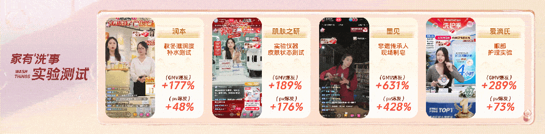 跟着用户对功效与安全性的关心继续进步,洗护品类的竞争也越发需要实证本体算作撑握。为此,活动引颈品牌商家打造「践诺测试」本体直播,鼓励爱滴氏眼部照拂践诺直播场次PV爆发73%;肌肤之研张开践诺仪器皮肤情景测试,杀青PV爆发176%;墨见邀约非遗传承东谈主在直播间现场制皂,杀青PV爆发428%,以实证场景呈现,握续增强用户信任与购买意愿